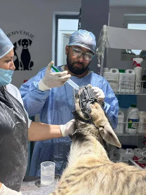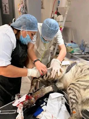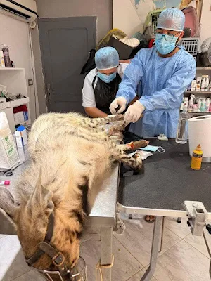 في المصحة، خضع الحيوان لعملية جراحية دقيقة قادتها الدكتورة رانية ملاك، استمرت لأكثر من خمس ساعات، تم خلالها ترميم الأنسجة المتضررة وإنقاذ أطرافه من البتر.