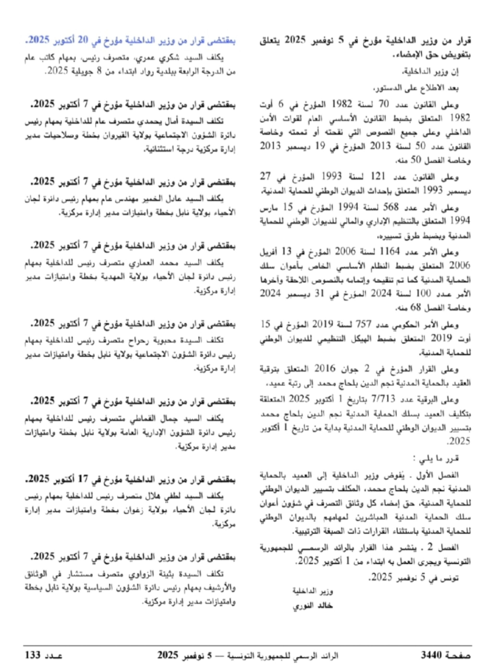 شهد العدد الأخير من الرائد الرسمي للجمهورية التونسية، الصادر يوم 5 نوفمبر 2025، صدور قرار رسمي عن وزير الداخلية تضمّن سلسلة من التسميات والإعفاءات داخل الإدارات المركزية والهياكل الفنية التابعة للوزارة. وجاء هذا القرار في إطار مراجعة شاملة لهيكلة الوزارة وتنظيمها الداخلي بهدف تحسين الأداء وتدعيم النجاعة في إدارة الملفات الأمنية والإدارية.