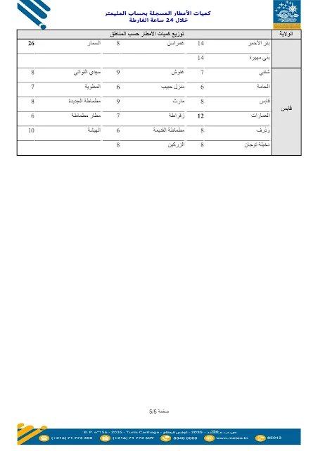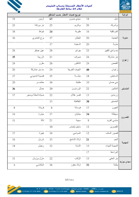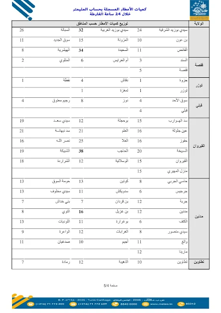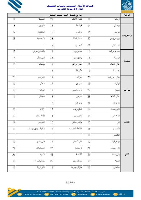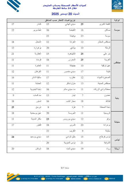 أعلن المعهد الوطني للرصد الجوي، في بلاغه الصادر صباح اليوم، عن نشر قائمة أولية تتعلق بكميات الأمطار التي شهدتها مختلف مناطق الجمهورية خلال الأربع والعشرين ساعة الماضية، وذلك في سياق متابعة دقيقة للتقلبات الجوية التي عرفتها البلاد خلال الأيام الأخيرة.وتندرج هذه المعطيات ضمن الفترة الممتدة من صباح الجمعة 19 ديسمبر 2025 إلى صباح السبت 20 ديسمبر 2025، وهي مرحلة اتسمت بنشاط ملحوظ للعوامل الجوية، خاصة في الشمال والوسط.