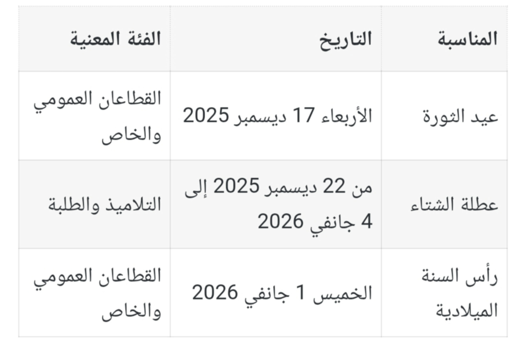يعكس توزيع العطل خلال ديسمبر 2025 توازنًا بين البعد الوطني والتربوي، حيث تتقاطع ذكرى الثورة مع فترة نهاية السنة الدراسية الأولى. هذا التلاقي يمنح العائلات هامشًا أكبر للتنظيم والراحة، لكنه يفرض في المقابل تحديات على بعض القطاعات الحيوية التي تبقى مطالبة بضمان استمرارية الخدمات. وتبقى حسن إدارة هذه المرحلة رهين التخطيط المسبق واحترام الروزنامة الرسمية.